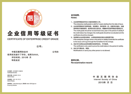 通過信用評價的企業(yè)將獲得由中國互聯(lián)網(wǎng)協(xié)會頒發(fā)的信用等級銅牌和證書(采用商務(wù)部和國資委統(tǒng)一制定的式樣,證書加蓋中國互聯(lián)網(wǎng)協(xié)會公章),如下圖示: