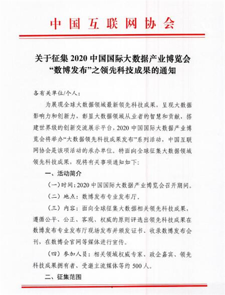關(guān)于征集2020中國國際大數(shù)據(jù)產(chǎn)業(yè)博覽會 “數(shù)博發(fā)布”之領(lǐng)先科技成果的通知
