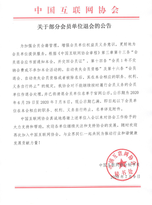 為加強(qiáng)會(huì)員會(huì)籍管理,增強(qiáng)會(huì)員單位權(quán)益及義務(wù)意識(shí),更好地為會(huì)員單位提供服務(wù),根據(jù)《中國(guó)互聯(lián)網(wǎng)協(xié)會(huì)章程》第三章第十三條“會(huì)員退會(huì)應(yīng)書面通知本會(huì),并交回會(huì)員證”,第十四條“會(huì)員1年不交納會(huì)費(fèi)或不參加本會(huì)活動(dòng)的,自動(dòng)喪失會(huì)員資格”及第十六條“會(huì)員退會(huì)、自動(dòng)喪失會(huì)員資格或者被除名后,其在本會(huì)相應(yīng)的職務(wù)、權(quán)利、義務(wù)自行終止”的規(guī)定,我協(xié)會(huì)對(duì)不能繼續(xù)按時(shí)履行會(huì)員義務(wù)的會(huì)員單位作退會(huì)處理,并已將清退會(huì)員單位名單于官網(wǎng)公示,公示期為2020年6月29日至2020年7月8日,現(xiàn)公示期已滿,即日起以下會(huì)員單位在本會(huì)相應(yīng)的職務(wù)、權(quán)利、義務(wù)自行終止,名單詳見附件。