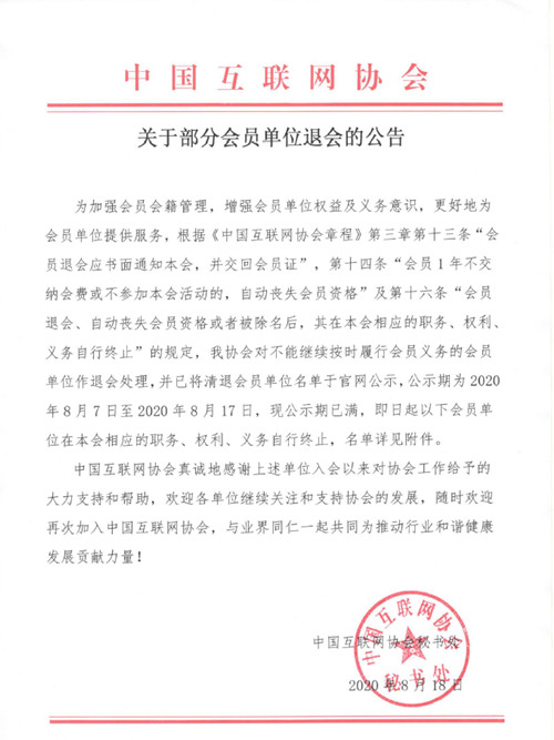 為加強(qiáng)會(huì)員會(huì)籍管理,增強(qiáng)會(huì)員單位權(quán)益及義務(wù)意識(shí),更好地為會(huì)員單位提供服務(wù),根據(jù)《中國(guó)互聯(lián)網(wǎng)協(xié)會(huì)章程》第三章第十三條“會(huì)員退會(huì)應(yīng)書(shū)面通知本會(huì),并交回會(huì)員證”,第十四條“會(huì)員1年不交納會(huì)費(fèi)或不參加本會(huì)活動(dòng)的,自動(dòng)喪失會(huì)員資格”及第十六條“會(huì)員退會(huì)、自動(dòng)喪失會(huì)員資格或者被除名后,其在本會(huì)相應(yīng)的職務(wù)、權(quán)利、義務(wù)自行終止”的規(guī)定,我協(xié)會(huì)對(duì)不能繼續(xù)按時(shí)履行會(huì)員義務(wù)的會(huì)員單位作退會(huì)處理,并已將清退會(huì)員單位名單于官網(wǎng)公示,公示期為2020年8月7日至2020年8月17日,現(xiàn)公示期已滿(mǎn),即日起以下會(huì)員單位在本會(huì)相應(yīng)的職務(wù)、權(quán)利、義務(wù)自行終止,名單詳見(jiàn)附件。