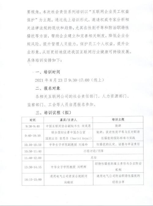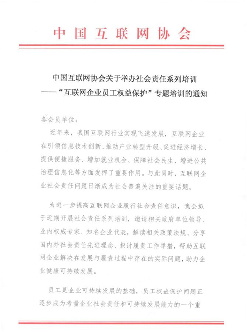 中國互聯(lián)網(wǎng)協(xié)會關(guān)于舉辦社會責(zé)任系列培訓(xùn) ——“互聯(lián)網(wǎng)企業(yè)員工權(quán)益保護(hù)”專題培訓(xùn)的通知