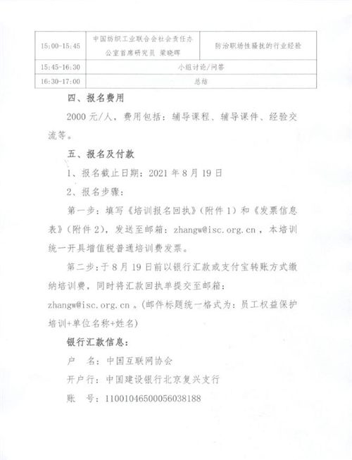 第二步:于8月19日前以銀行匯款或支付寶轉(zhuǎn)賬方式繳納培訓(xùn)費,同時將匯款回執(zhí)單提交至郵箱:zhangw@isc.org.cn 。(郵件標(biāo)題統(tǒng)一格式為:員工權(quán)益保護(hù)培訓(xùn)+單位名稱+姓名)